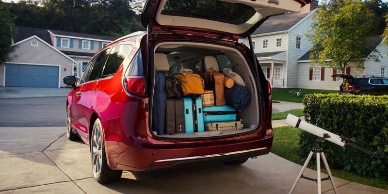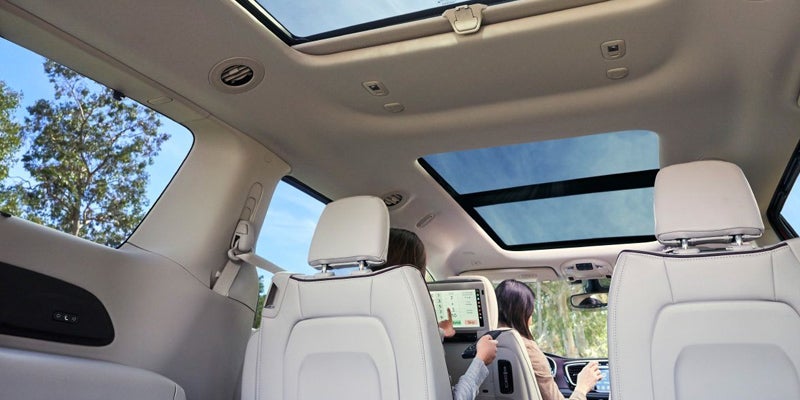 There are six trims available for the Pacifica. These include the L, LX, Touring Plus, Touring L, Touring L Plus, and the Limited. There is also an additional option to choose the Pacifica Hybrid. Available exterior features include hands-free power sliding side doors and a hands-free power liftgate, which are standard on the Limited trim and optional on the Touring L Plus. Power sliding doors and a power liftgate is standard on the Touring Plus, Touring L, and Touring L Plus. For additional light in your van, you can get a tri-pane panoramic sunroof, which is standard on the Limited trim and is an option available on the Touring L Plus trim.